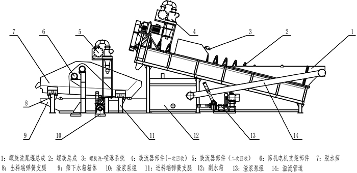 同時(shí)螺旋洗砂裝置中清洗后剩余的廢水(包含流失的細(xì)砂)經(jīng)溢流裝置進(jìn)入振動(dòng)篩下水槽,由泵送至回收裝置,在離心力的作用下進(jìn)行細(xì)砂回收。