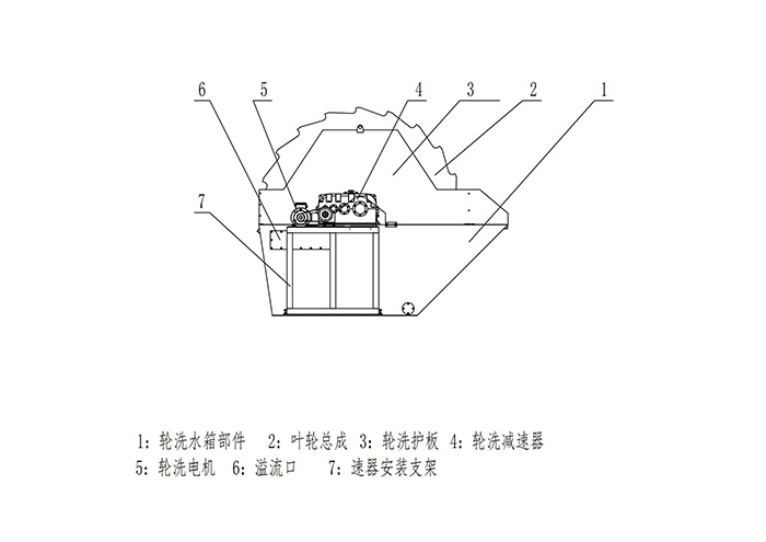 工作時,物料在葉輪的帶動下進行清洗,除去覆蓋在砂石表面的雜質(zhì),同時在水流的作用下將雜質(zhì)及粒度較小的泥,粉等帶走,完成清洗,洗過的砂石由輪斗提升脫水,并經(jīng)噴淋裝置進行二次沖洗,沖洗后再次提升脫水,從出料端產(chǎn)出干凈的砂。